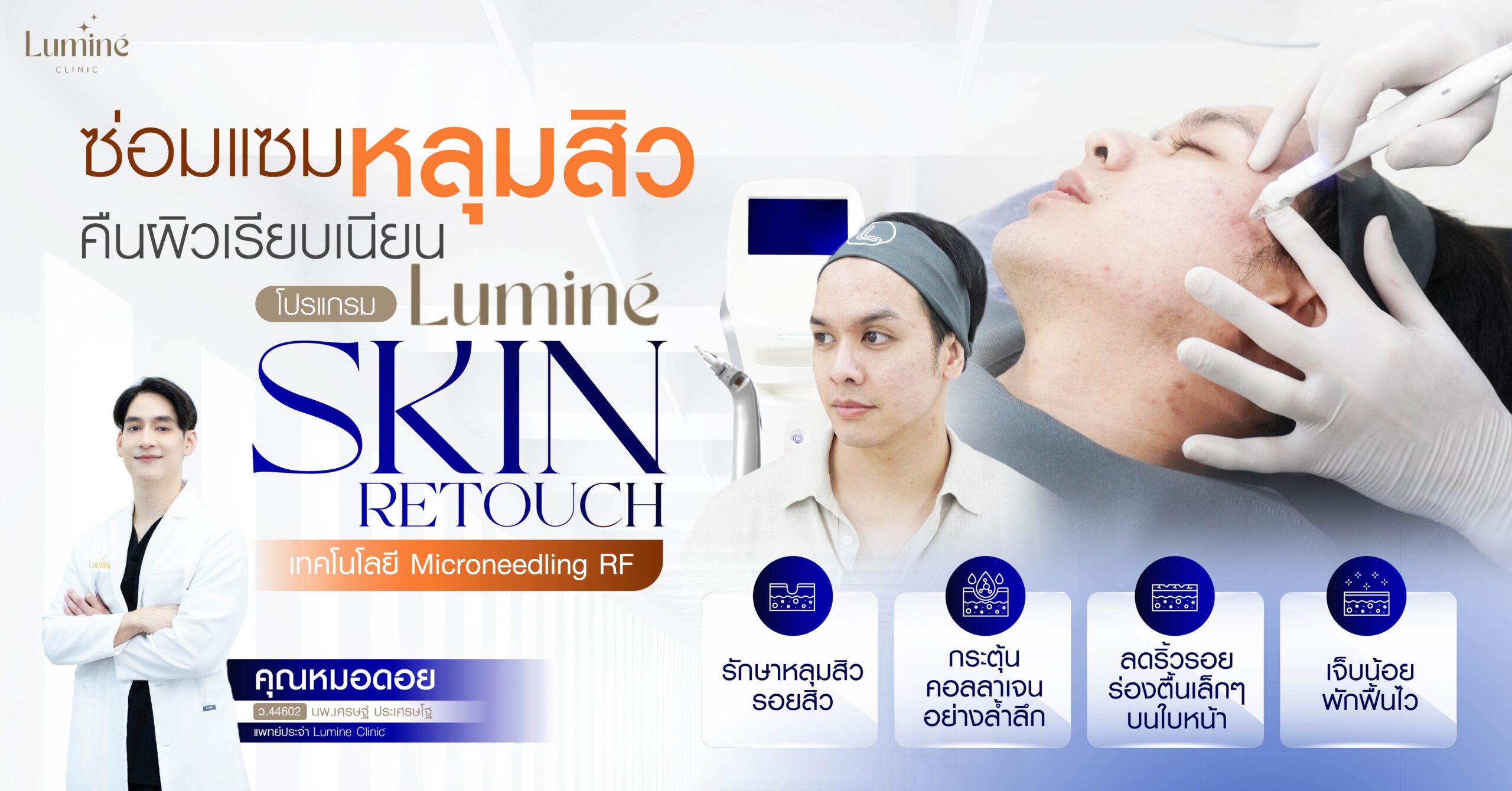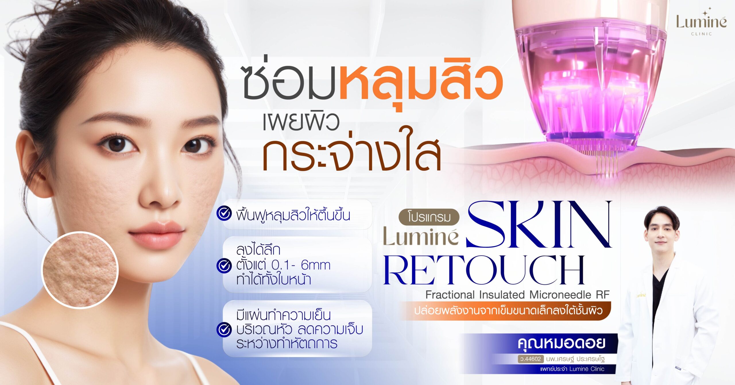 Luminé Clinic เข้าใจถึงปัญหาหลุมสิวที่ยากแก้ไข จึงคิดค้น โปรแกรม Luminé Skin Retouch ที่ผสานเทคโนโลยี Fractional Insulated Microneedle RF ช่วยปล่อยพลังงานลึกลงใต้ผิว ตรงเข้าซ่อมหลุมสิว รอยแผลเป็น และรูขุมขนกว้าง